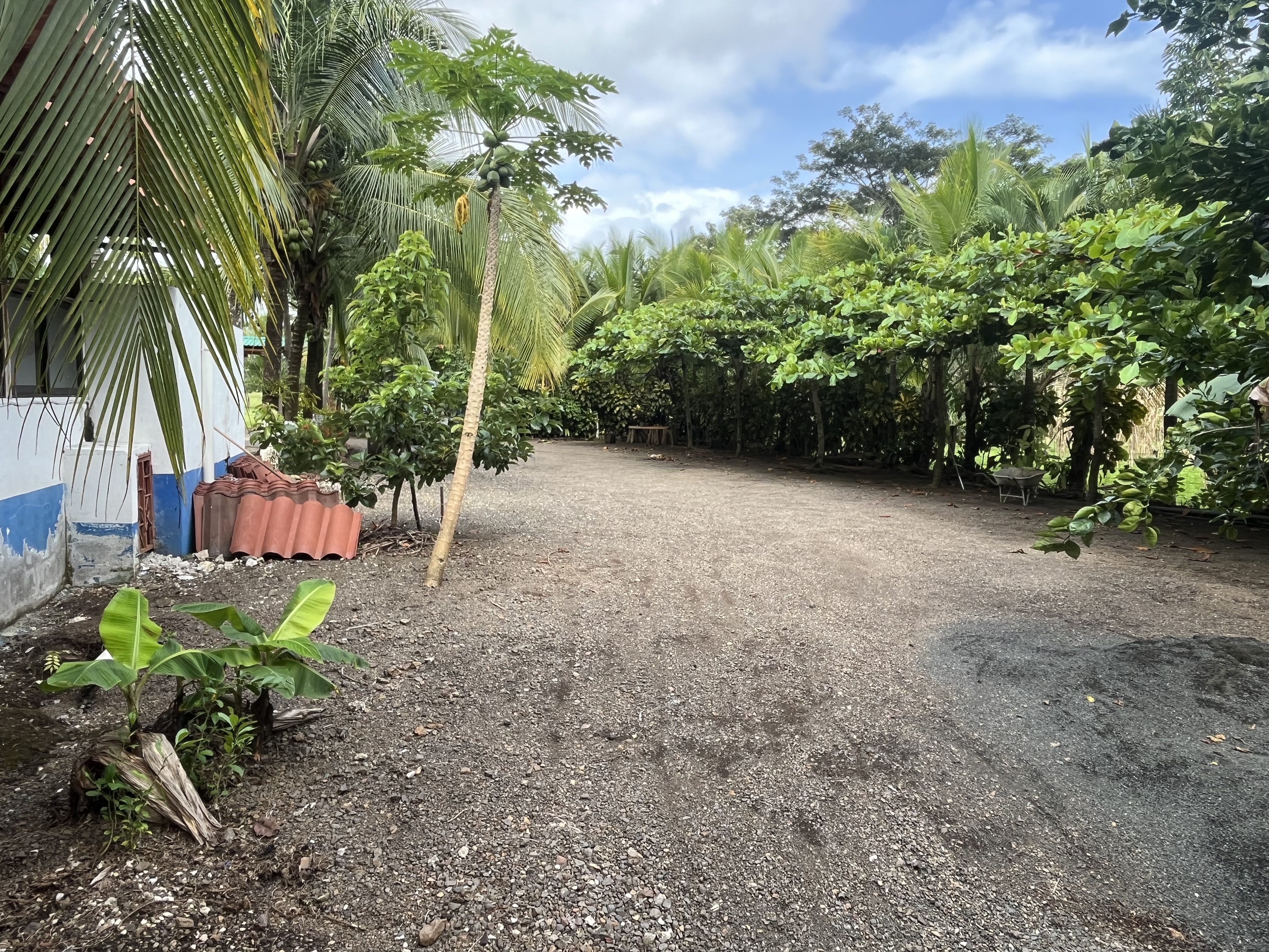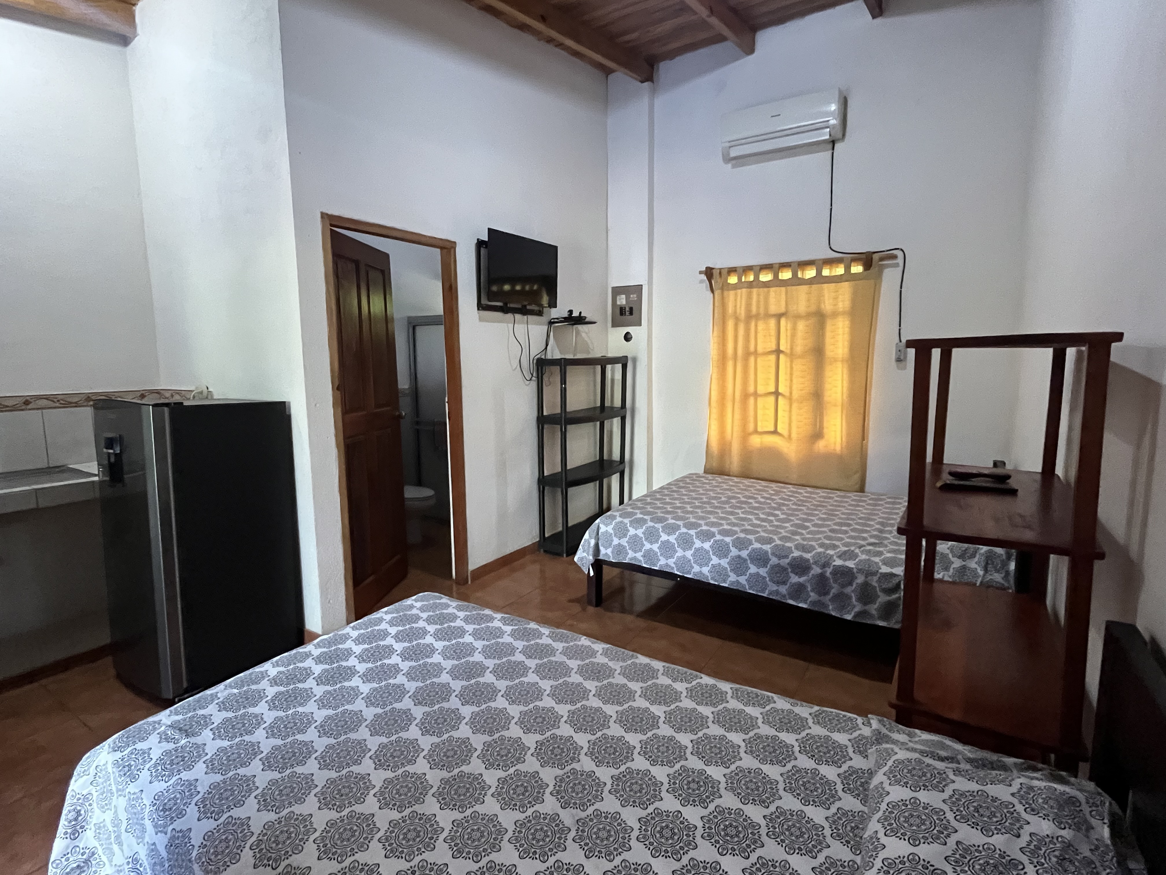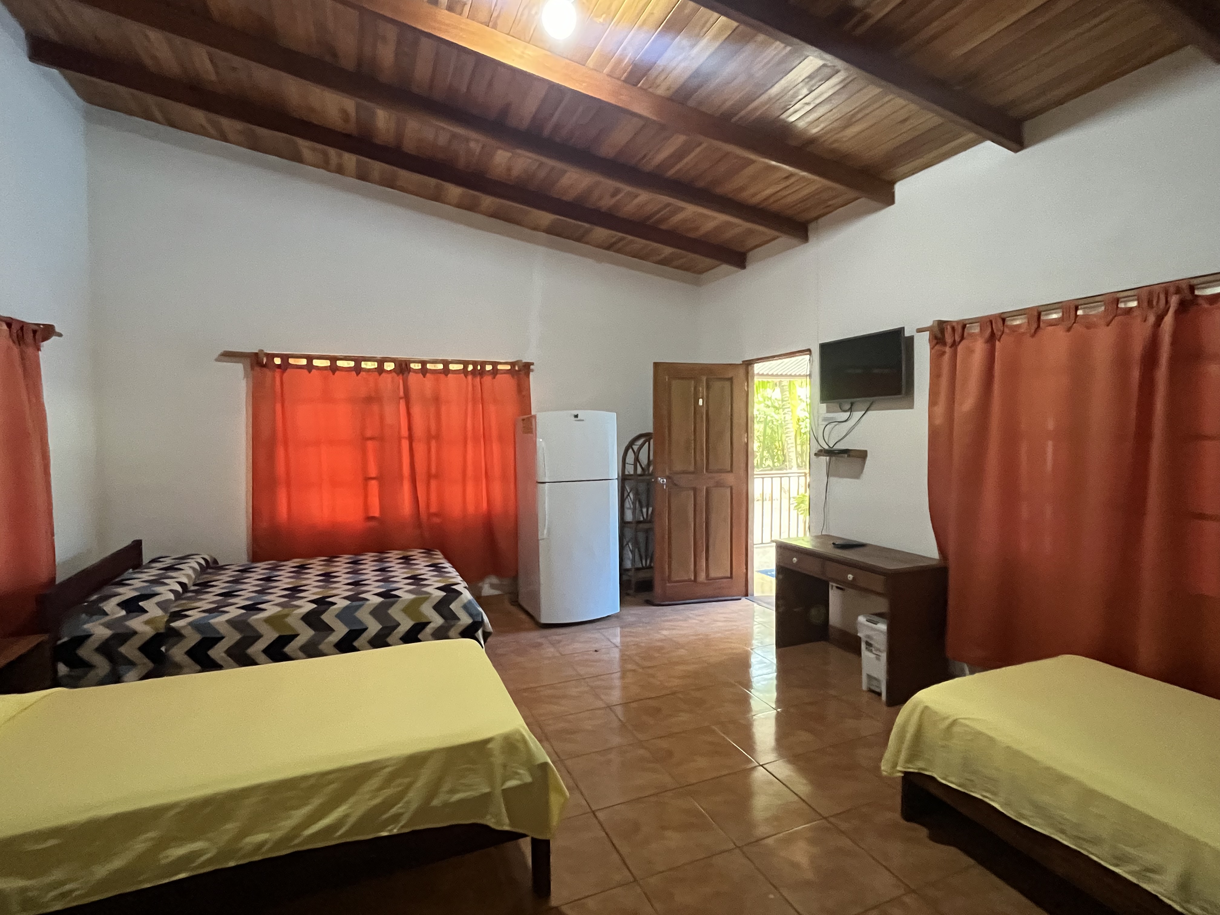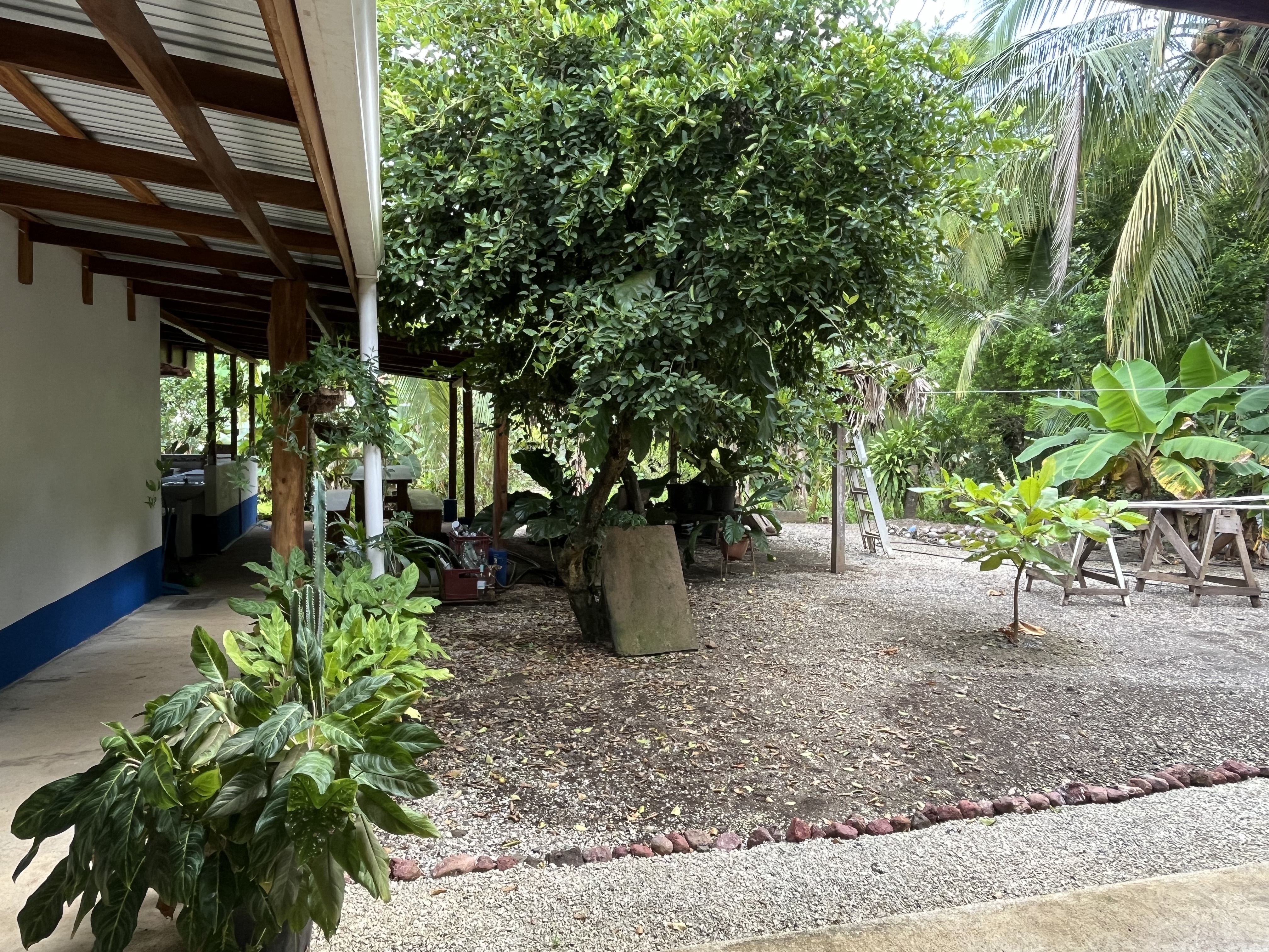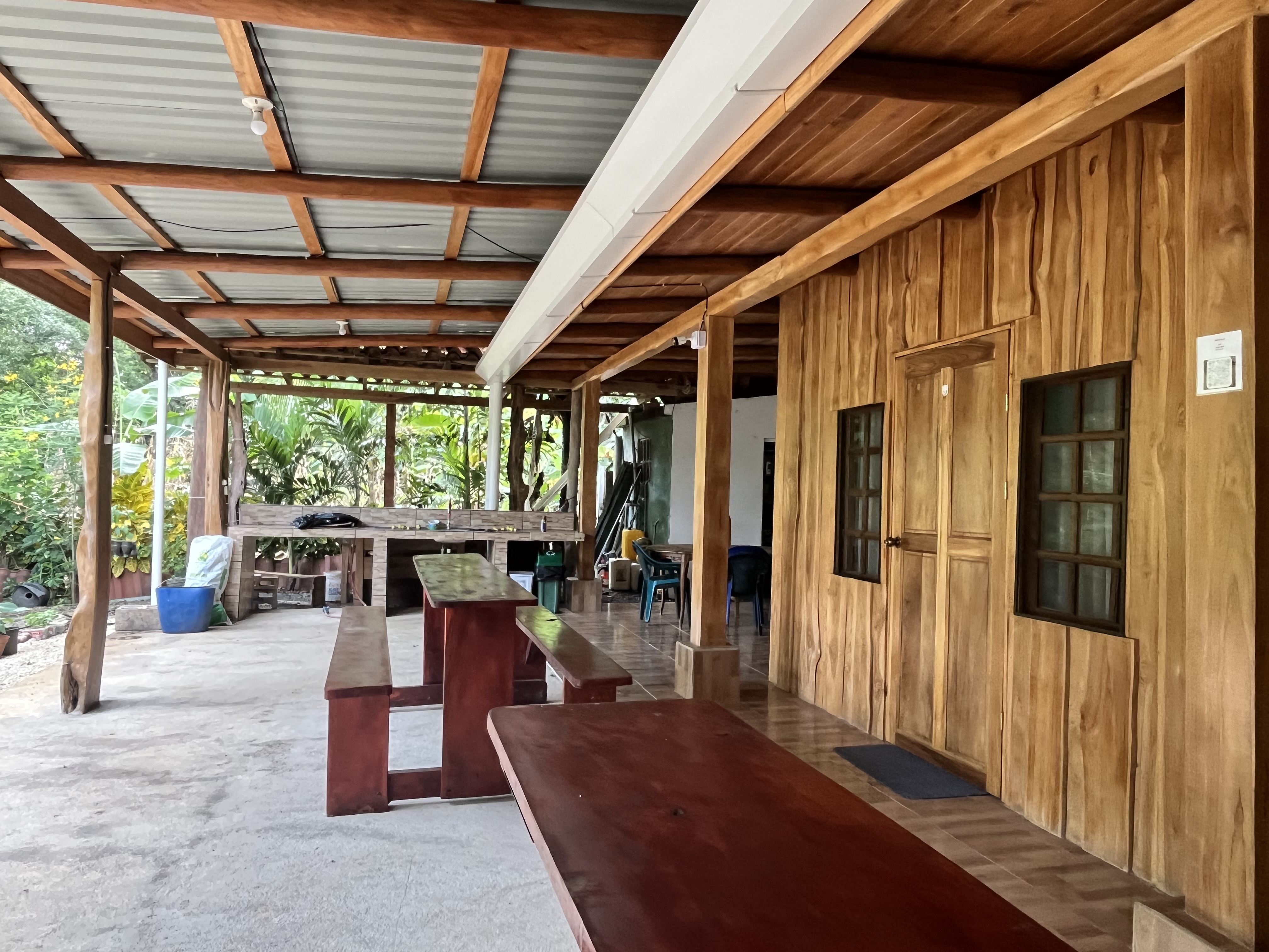 In the second section, a cozy common area offers a relaxing space surrounded by fruit trees like lime and papaya. This area also features three rustic-style rooms and individual-sized beds made with local wood, perfect for solo travelers. Additionally, close to these rooms is another storage room with a big capacity that can eventually be converted into another room.