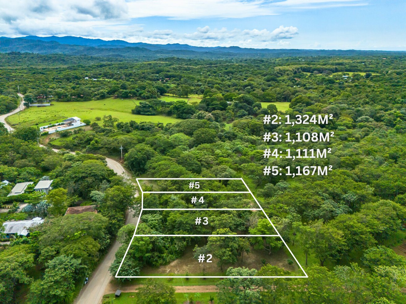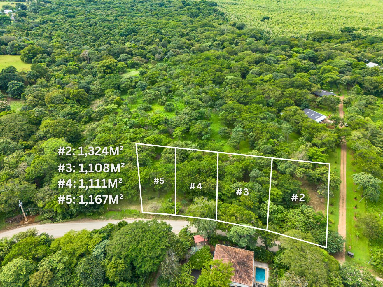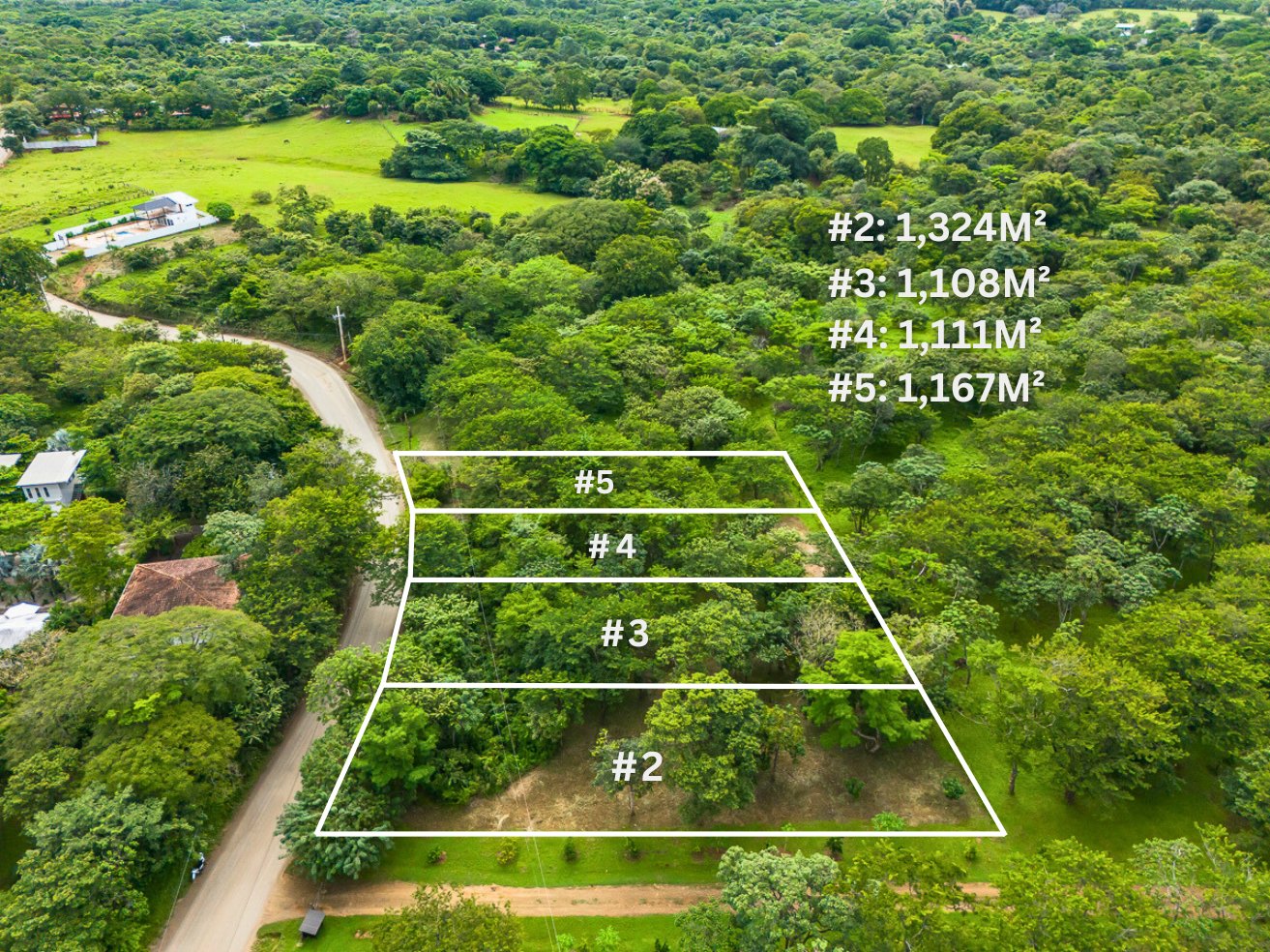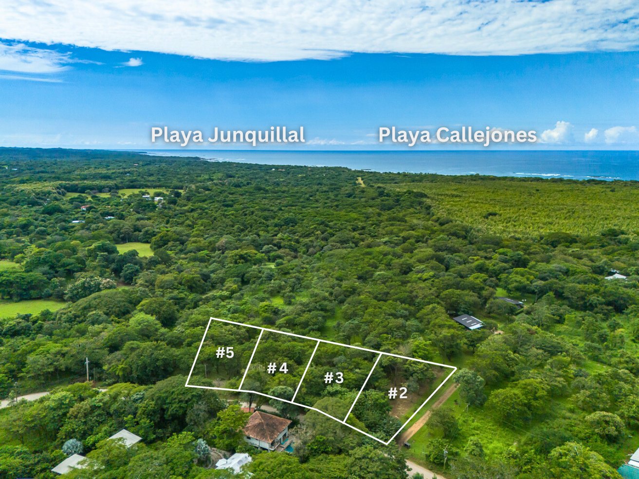 This dividable lot #5 is 1,160 m2 with 19m frontage on the public road leading to Playa Negra, 2.2km to the beach.